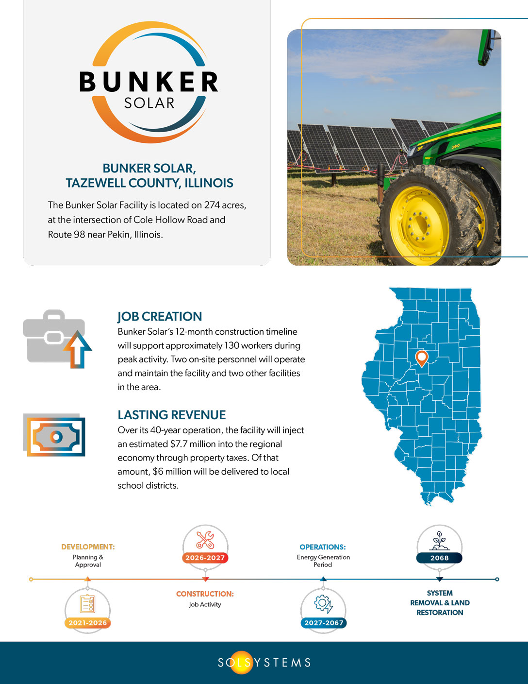 The Bunker Solar Facility is located on 274 acres, at the intersection of Cole Hollow Road and Route 98 near Pekin, Illinois.